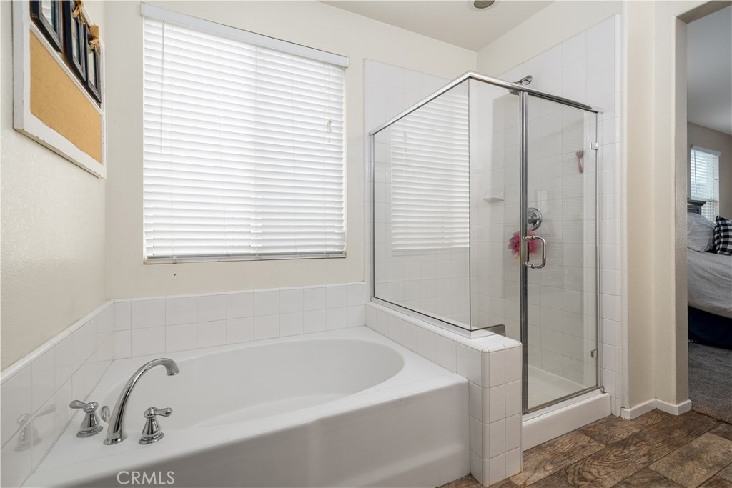 The private primary suite includes a soaking tub, dual vanities, a walk-in closet, and a separate shower. Three additional generously sized rooms, a full bath with dual sinks, and an indoor laundry room offer both comfort and convenience.