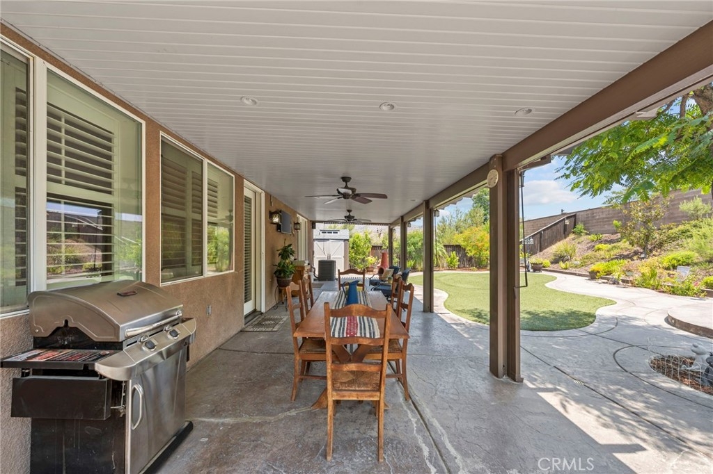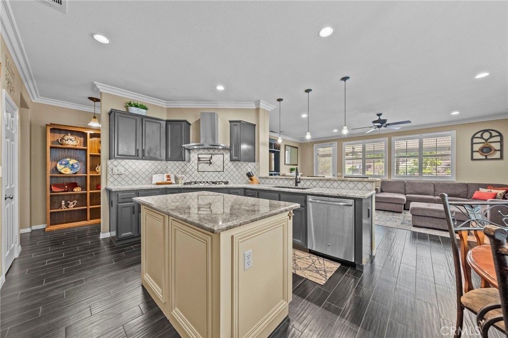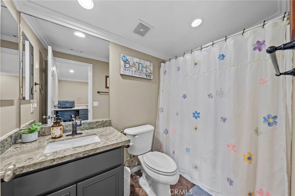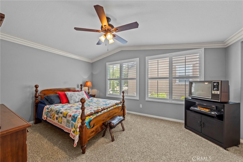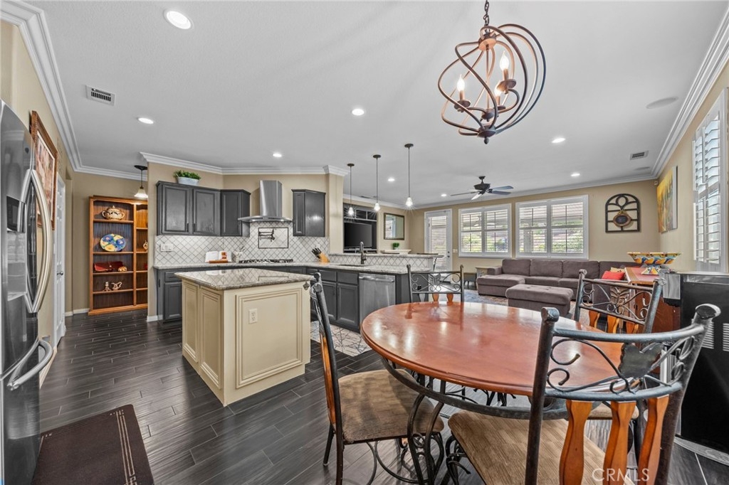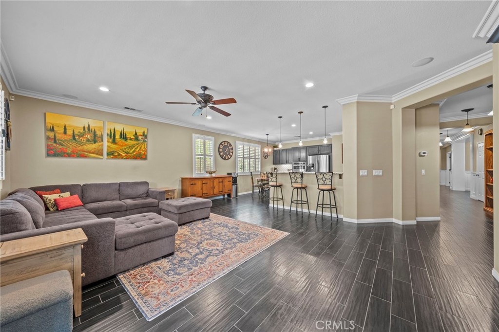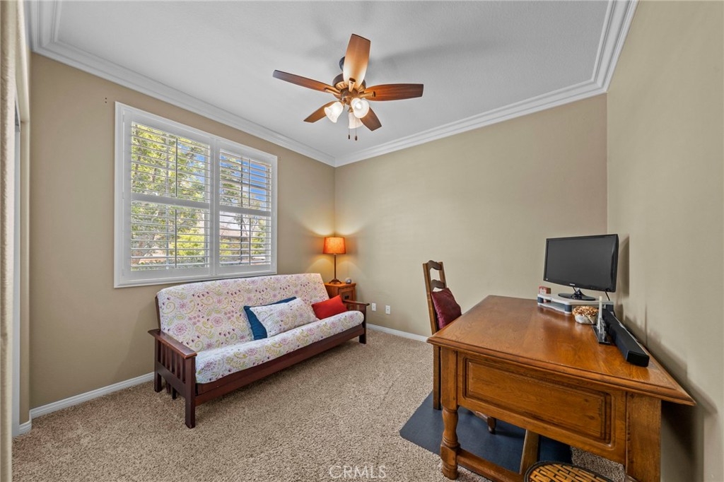 Located in the highly desirable Sycamore Creek community this move-in ready home featuring 4 bedrooms, 4 full bathrooms, an office, and an expansive upstairs loft. This highly sought-after floor plan lives like a single story, with the primary suite, two guest bedrooms, an office, and three full bathrooms conveniently located on the main floor. A formal dining room sits separately from the main living area, while the open-concept kitchen and spacious family room create the perfect setting for everyday living and entertaining. The beautifully remodeled kitchen features an island, granite countertops, custom backsplash with a pot filler, stainless steel appliances, ample cabinet space including pull-out drawers for added functionality, a coffee bar, and a breakfast bar that opens seamlessly to the family room. The spacious primary en-suite offers direct access to the backyard through a private door. It also features a bathroom with a jetted bathtub, a walk-in shower, and a large walk-in closet complete with custom organizers. Upstairs offers a versatile bonus space ideal for guests or multigenerational living, complete with a large loft, private bedroom, full bathroom, and a convenient mini kitchenette perfect as a private retreat or flexible living area. Step outside to your lush and serene backyard oasis, thoughtfully designed with artificial turf, custom hardscaping, and mature fruit trees including lemon, lime, orange, and calamansi. The Alumawood patio cover with built-in lighting, ceiling fans and outdoor speakers makes it an entertainer’s dream, and the yard is large enough to add a pool if desired. Additional highlights include dual AC units, built-in speakers inside and out, plantation shutters, crown molding, wainscotting, a security screen door, tankless water heater, and Solar for energy efficiency. The home also includes a 2 car garage, which features epoxy flooring, cabinets, a workbench, and overhead and wall storage racks. The community has LOW HOA fees, which include pools, fitness center, clubhouse, walking trails, and parks. Deleo Regional Sports Park is centered in Sycamore Creek offering NEW PICKLEBALL COURTS, NEW BMX BIKE PARK, Skate Park, Dog Park, Soccer & Baseball Fields, Tennis & Basketball Courts, BBQs & Picnic Areas! Residents enjoy close proximity to shopping, dining, golf courses, hiking trails, nearby 15 freeway access, and GREAT SCHOOLS.
