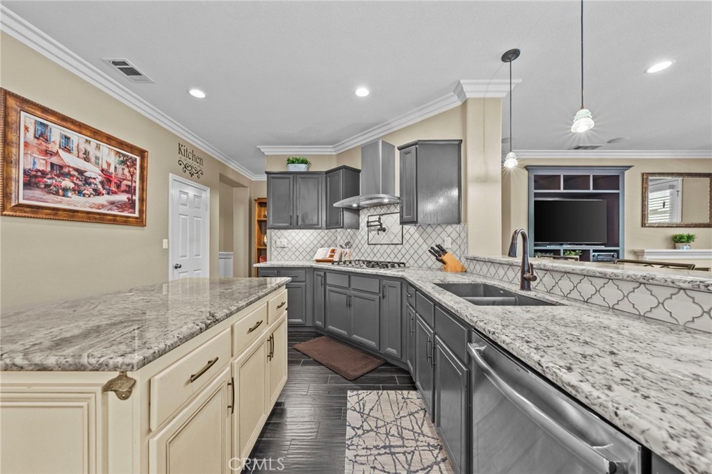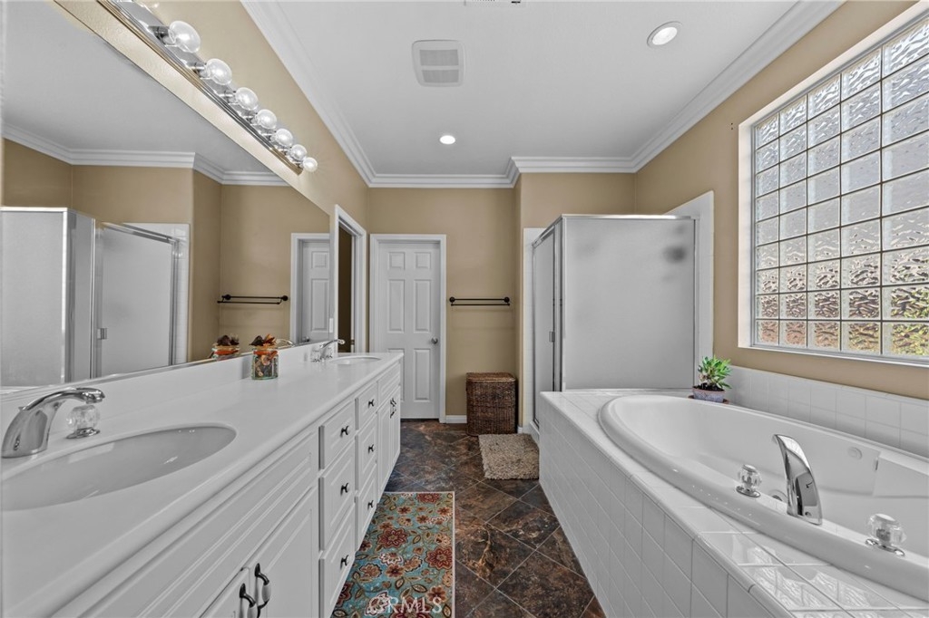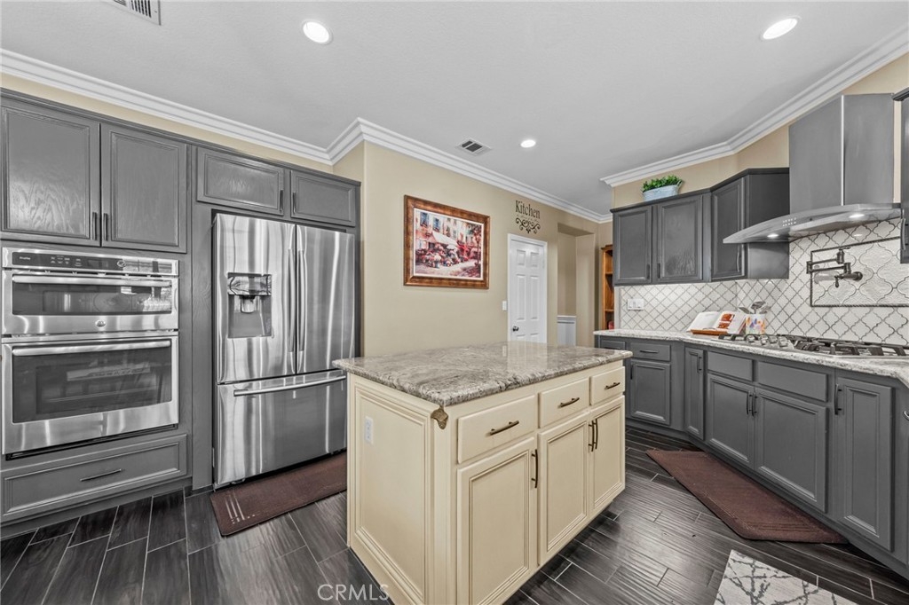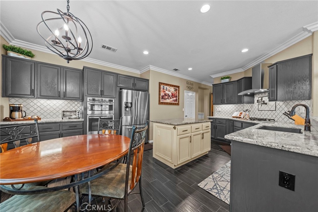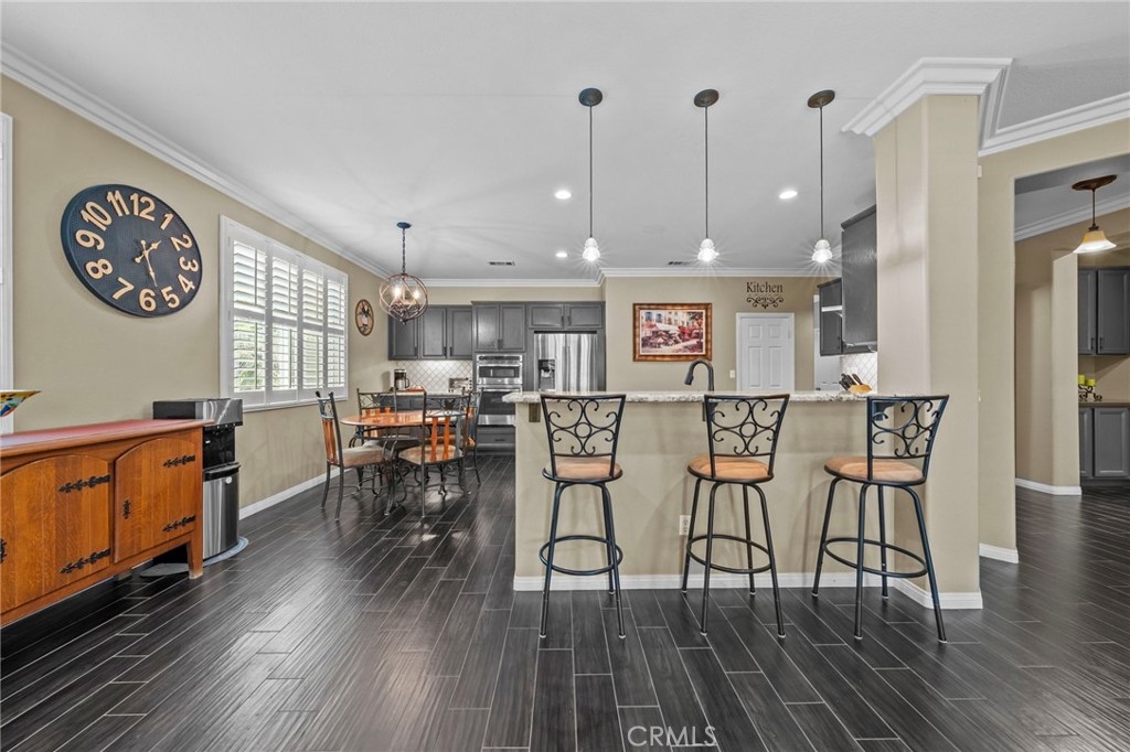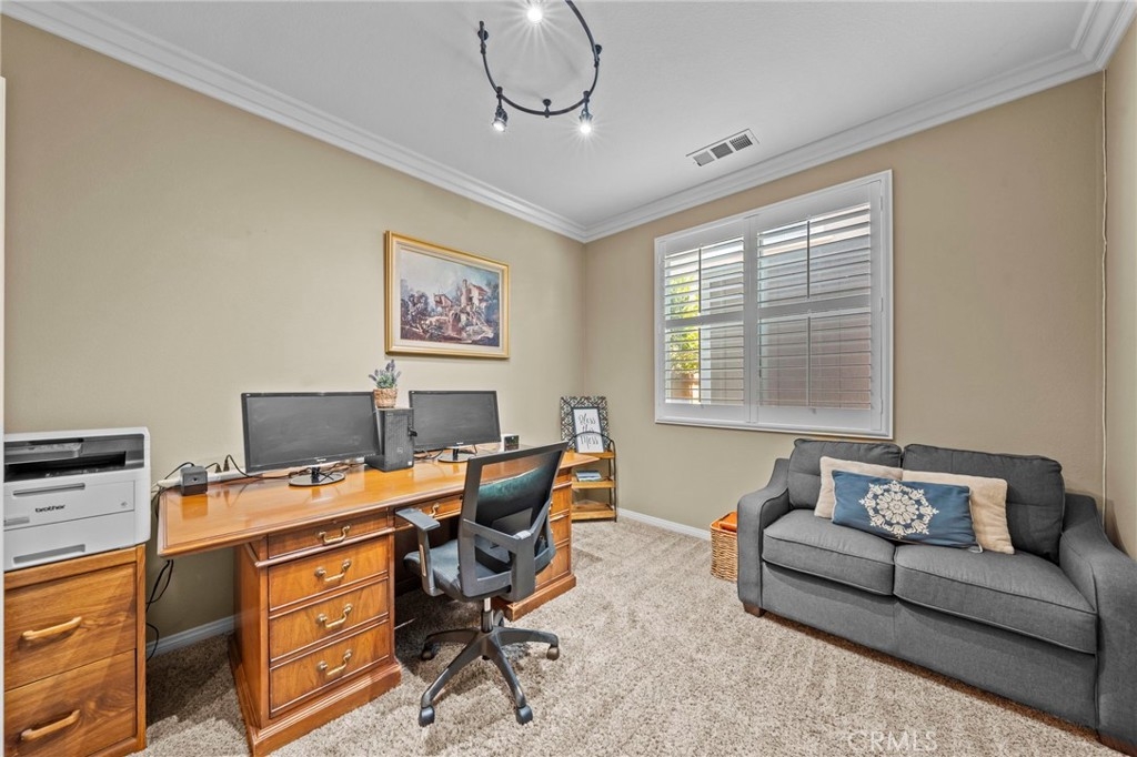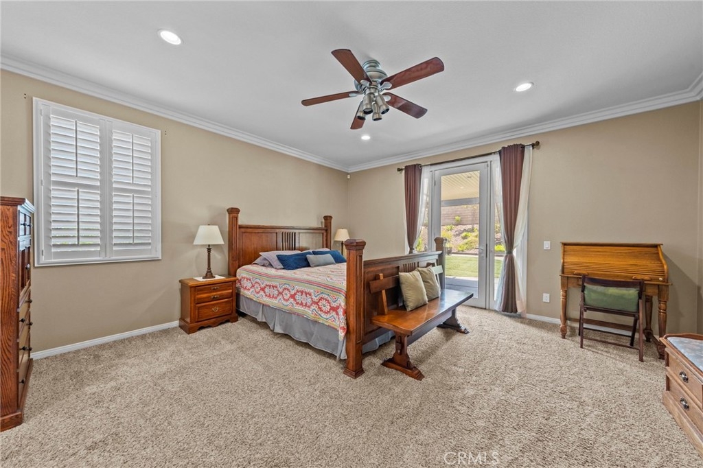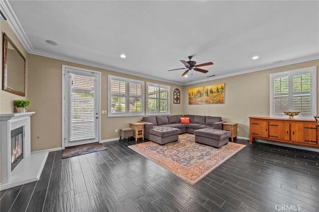 Located in the highly desirable Sycamore Creek community this move-in ready home featuring 4 bedrooms, 4 full bathrooms, an office, and an expansive upstairs loft. This highly sought-after floor plan lives like a single story, with the primary suite, two guest bedrooms, an office, and three full bathrooms conveniently located on the main floor. A formal dining room sits separately from the main living area, while the open-concept kitchen and spacious family room create the perfect setting for everyday living and entertaining. The beautifully remodeled kitchen features an island, granite countertops, custom backsplash with a pot filler, stainless steel appliances, ample cabinet space including pull-out drawers for added functionality, a coffee bar, and a breakfast bar that opens seamlessly to the family room. The spacious primary en-suite offers direct access to the backyard through a private door. It also features a bathroom with a jetted bathtub, a walk-in shower, and a large walk-in closet complete with custom organizers. Upstairs offers a versatile bonus space ideal for guests or multigenerational living, complete with a large loft, private bedroom, full bathroom, and a convenient mini kitchenette perfect as a private retreat or flexible living area. Step outside to your lush and serene backyard oasis, thoughtfully designed with artificial turf, custom hardscaping, and mature fruit trees including lemon, lime, orange, and calamansi. The Alumawood patio cover with built-in lighting, ceiling fans and outdoor speakers makes it an entertainer’s dream, and the yard is large enough to add a pool if desired. Additional highlights include dual AC units, built-in speakers inside and out, plantation shutters, crown molding, wainscotting, a security screen door, tankless water heater, and Solar for energy efficiency. The home also includes a 2 car garage, which features epoxy flooring, cabinets, a workbench, and overhead and wall storage racks. The community has LOW HOA fees, which include pools, fitness center, clubhouse, walking trails, and parks. Deleo Regional Sports Park is centered in Sycamore Creek offering NEW PICKLEBALL COURTS, NEW BMX BIKE PARK, Skate Park, Dog Park, Soccer & Baseball Fields, Tennis & Basketball Courts, BBQs & Picnic Areas! Residents enjoy close proximity to shopping, dining, golf courses, hiking trails, nearby 15 freeway access, and GREAT SCHOOLS.