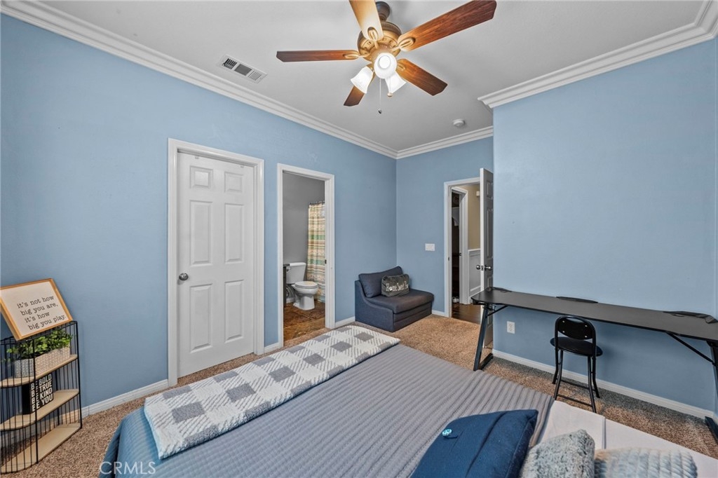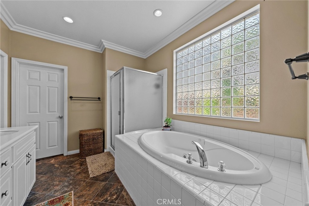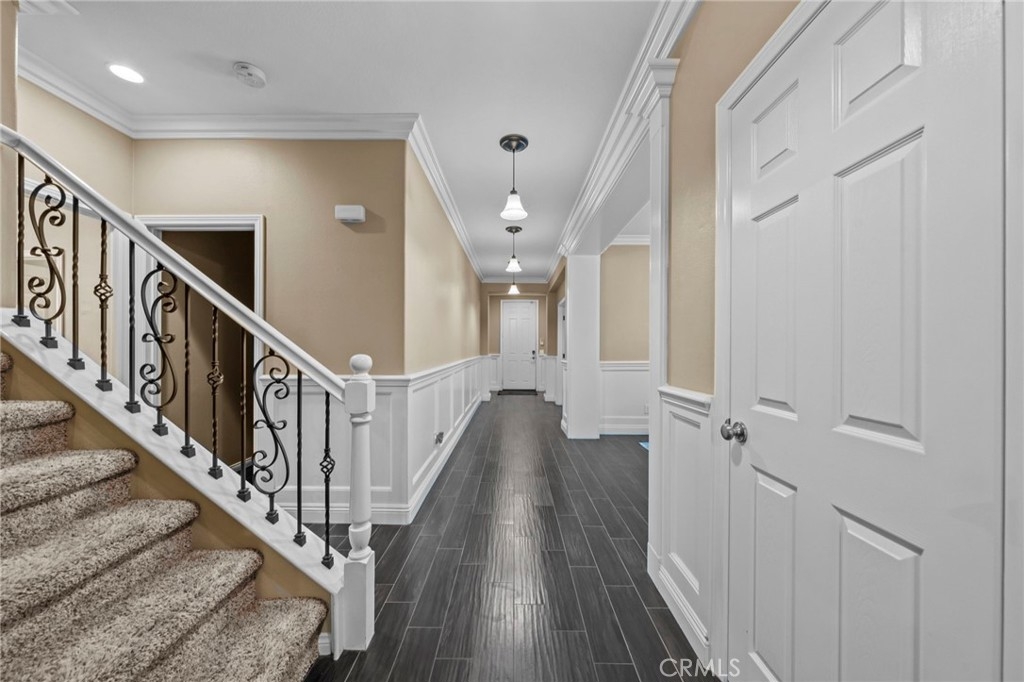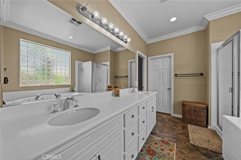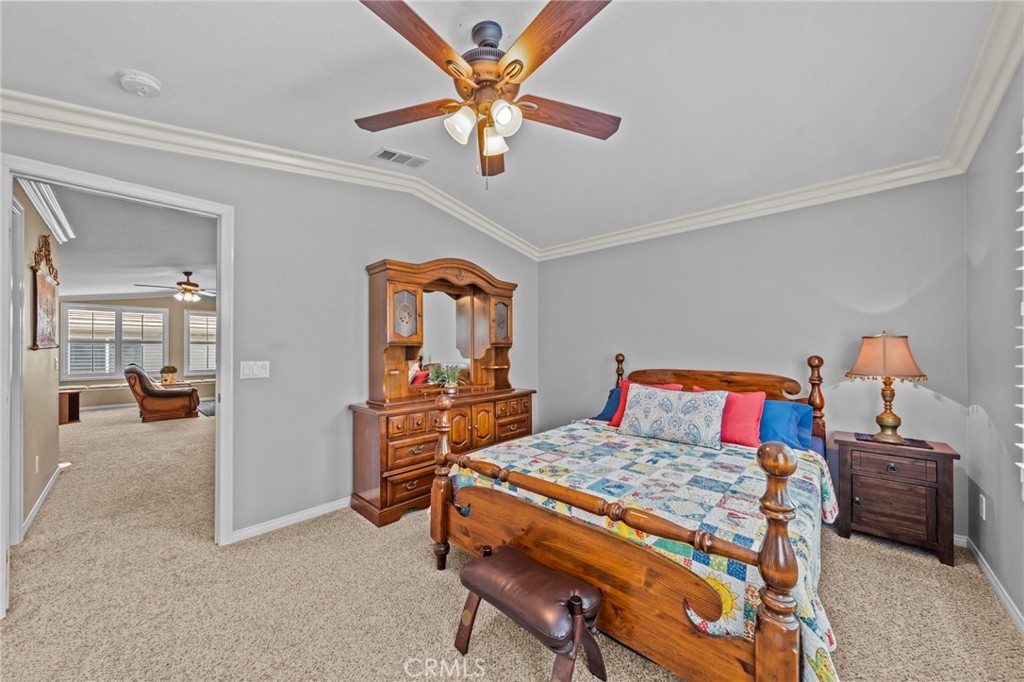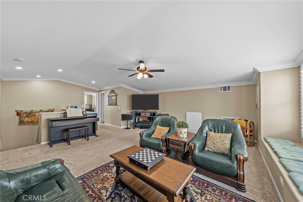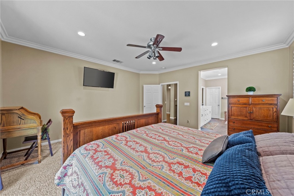Located in the highly desirable Sycamore Creek community this move-in ready home featuring 4 bedrooms, 4 full bathrooms, an office, and an expansive upstairs loft. This highly sought-after floor plan lives like a single story, with the primary suite, two guest bedrooms, an office, and three full bathrooms conveniently located on the main floor. A formal dining room sits separately from the main living area, while the open-concept kitchen and spacious family room create the perfect setting for everyday living and entertaining. The beautifully remodeled kitchen features an island, granite countertops, custom backsplash with a pot filler, stainless steel appliances, ample cabinet space including pull-out drawers for added functionality, a coffee bar, and a breakfast bar that opens seamlessly to the family room. The spacious primary en-suite offers direct access to the backyard through a private door. It also features a bathroom with a jetted bathtub, a walk-in shower, and a large walk-in closet complete with custom organizers. Upstairs offers a versatile bonus space ideal for guests or multigenerational living, complete with a large loft, private bedroom, full bathroom, and a convenient mini kitchenette perfect as a private retreat or flexible living area. Step outside to your lush and serene backyard oasis, thoughtfully designed with artificial turf, custom hardscaping, and mature fruit trees including lemon, lime, orange, and calamansi. The Alumawood patio cover with built-in lighting, ceiling fans and outdoor speakers makes it an entertainer’s dream, and the yard is large enough to add a pool if desired. Additional highlights include dual AC units, built-in speakers inside and out, plantation shutters, crown molding, wainscotting, a security screen door, tankless water heater, and Solar for energy efficiency. The home also includes a 2 car garage, which features epoxy flooring, cabinets, a workbench, and overhead and wall storage racks. The community has LOW HOA fees, which include pools, fitness center, clubhouse, walking trails, and parks. Deleo Regional Sports Park is centered in Sycamore Creek offering NEW PICKLEBALL COURTS, NEW BMX BIKE PARK, Skate Park, Dog Park, Soccer & Baseball Fields, Tennis & Basketball Courts, BBQs & Picnic Areas! Residents enjoy close proximity to shopping, dining, golf courses, hiking trails, nearby 15 freeway access, and GREAT SCHOOLS.
