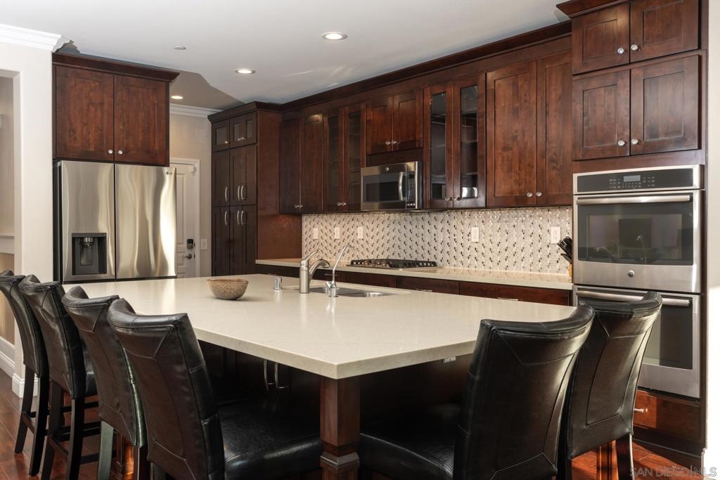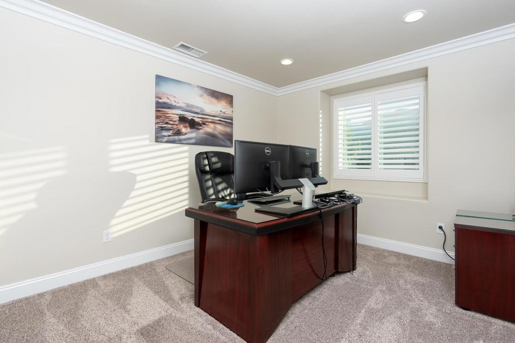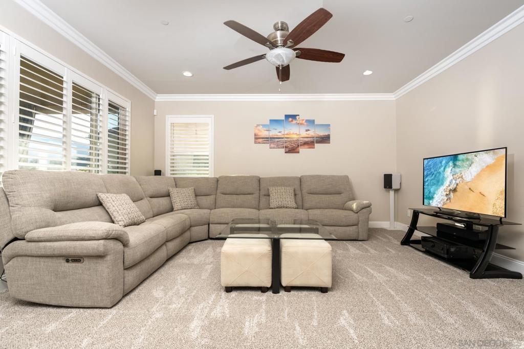 This stunning 4-bedroom, 3.5-bath Sycamore Creek residence in the heart of Temescal Valley blends elegant upgrades with rare, serene mountain views enjoyed from the dining room, the first-floor primary suite, and the private backyard. A dramatic two-story foyer with wainscoting opens to an expansive great room and a beautifully upgraded kitchen featuring custom wood cabinetry, motion-sensing interior lighting, a massive island with additional storage, custom backsplash, and a full walk-in pantry. The dining area is perfectly positioned to capture sweeping greenbelt and mountain vistas, creating a peaceful backdrop for everyday living. The first floor includes a versatile den/office or 5th bedroom option and a private primary suite with direct views of the surrounding hills. Upstairs, a spacious loft offers an ideal second living space, along with a second primary suite showcasing panoramic mountain scenery, an oversized custom spa shower, dual vanities, and two walk-in closets including a boutique-style built-in. Additional features include plantation shutters, crown molding, wood-look tile flooring, recessed lighting, roof mounted solar panels, and a 3-car garage with epoxy flooring and custom storage. Step outside to a professionally designed backyard with a built-in covered patio and uninterrupted views - no rear neighbors, just tranquil open space and rolling mountains. Residents enjoy resort-style amenities including pools, gym, clubhouse, sports park, playgrounds, and scenic trails, in addition to short 6-minute walks to Vons, CVS, Starbucks, restaurants and more. Please wear booties or remove shoes on carpet.